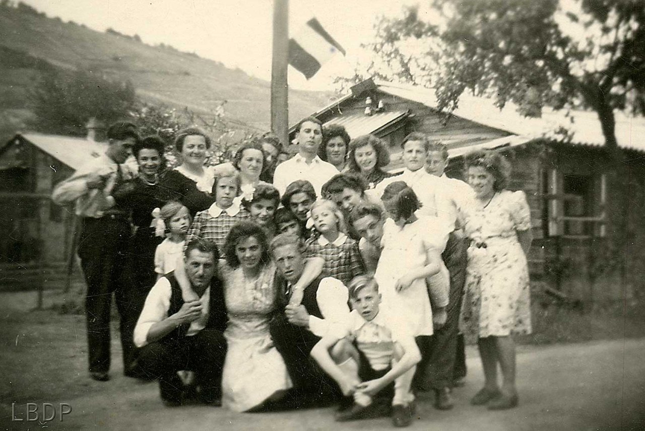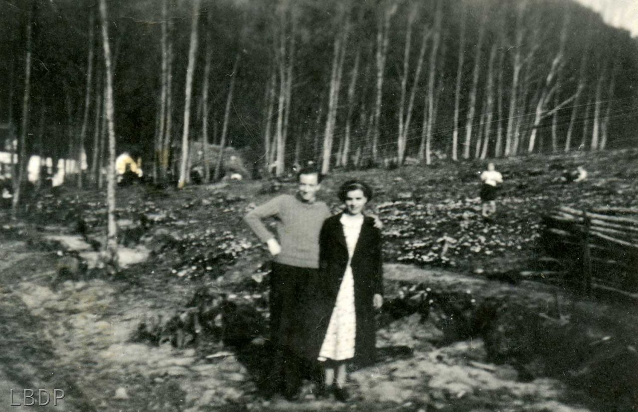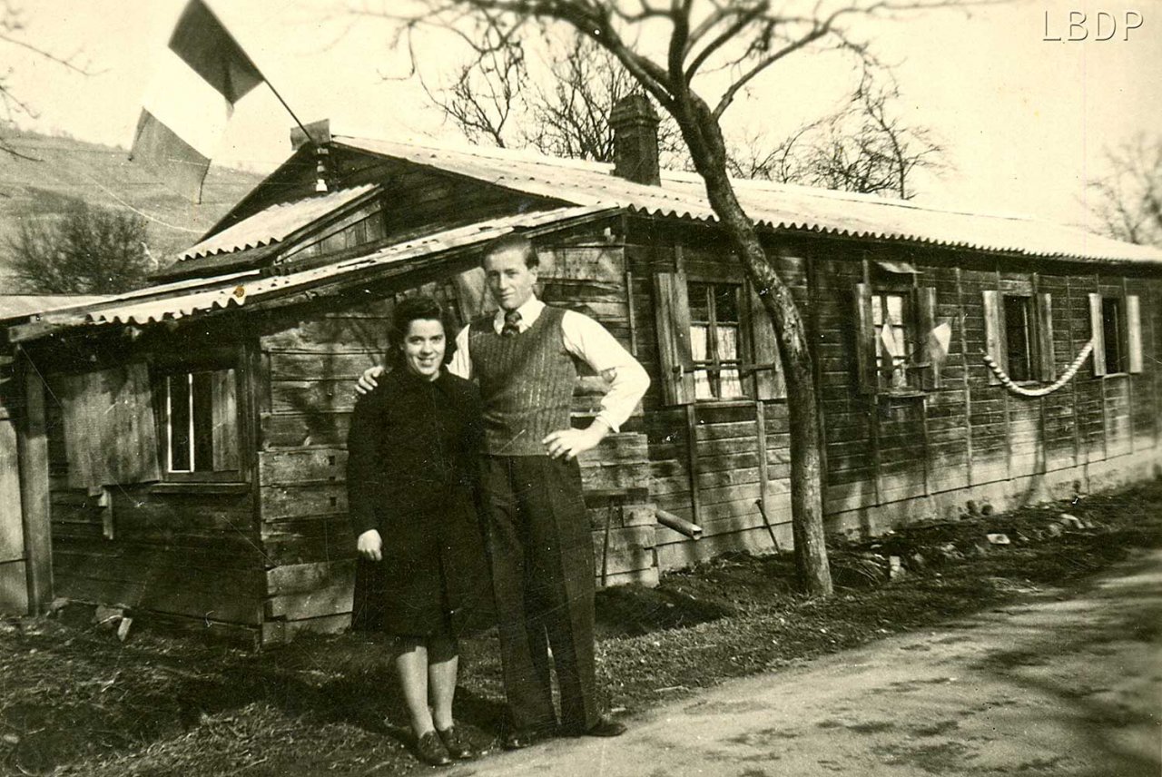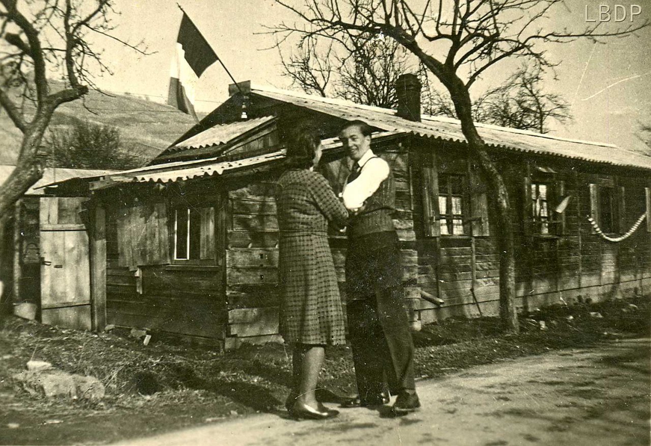 45 - Le 14 juillet 1945 : Beyer Joseph et Maurer Marguerite devant la baraque N° 16 où habitait la famille de 1941 à 1955