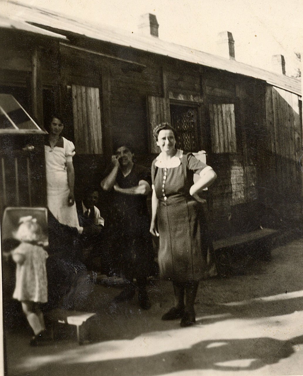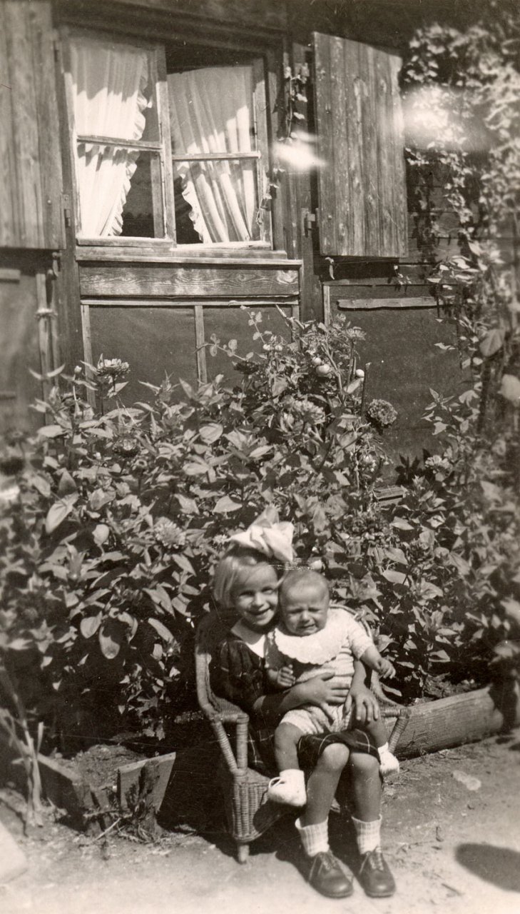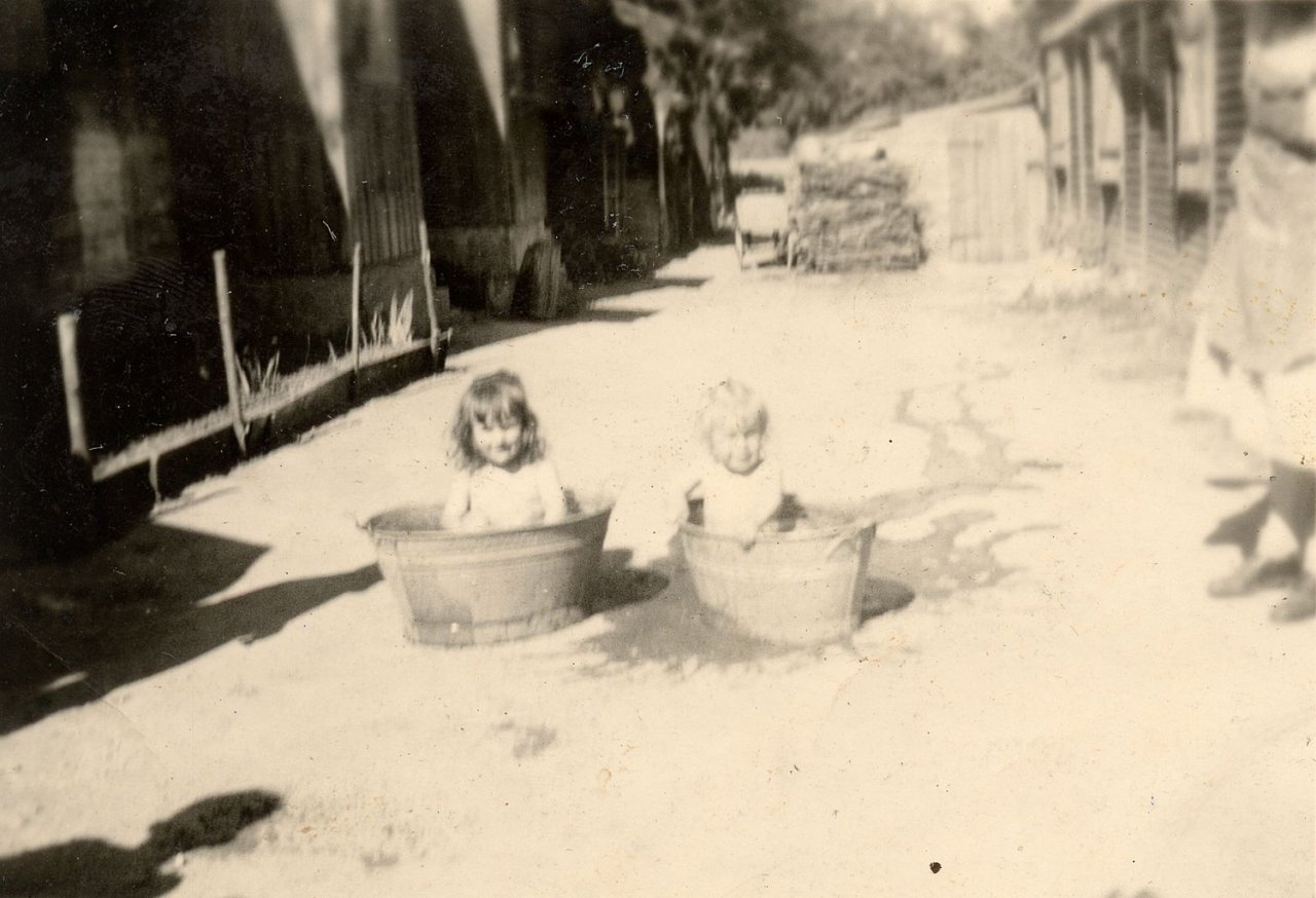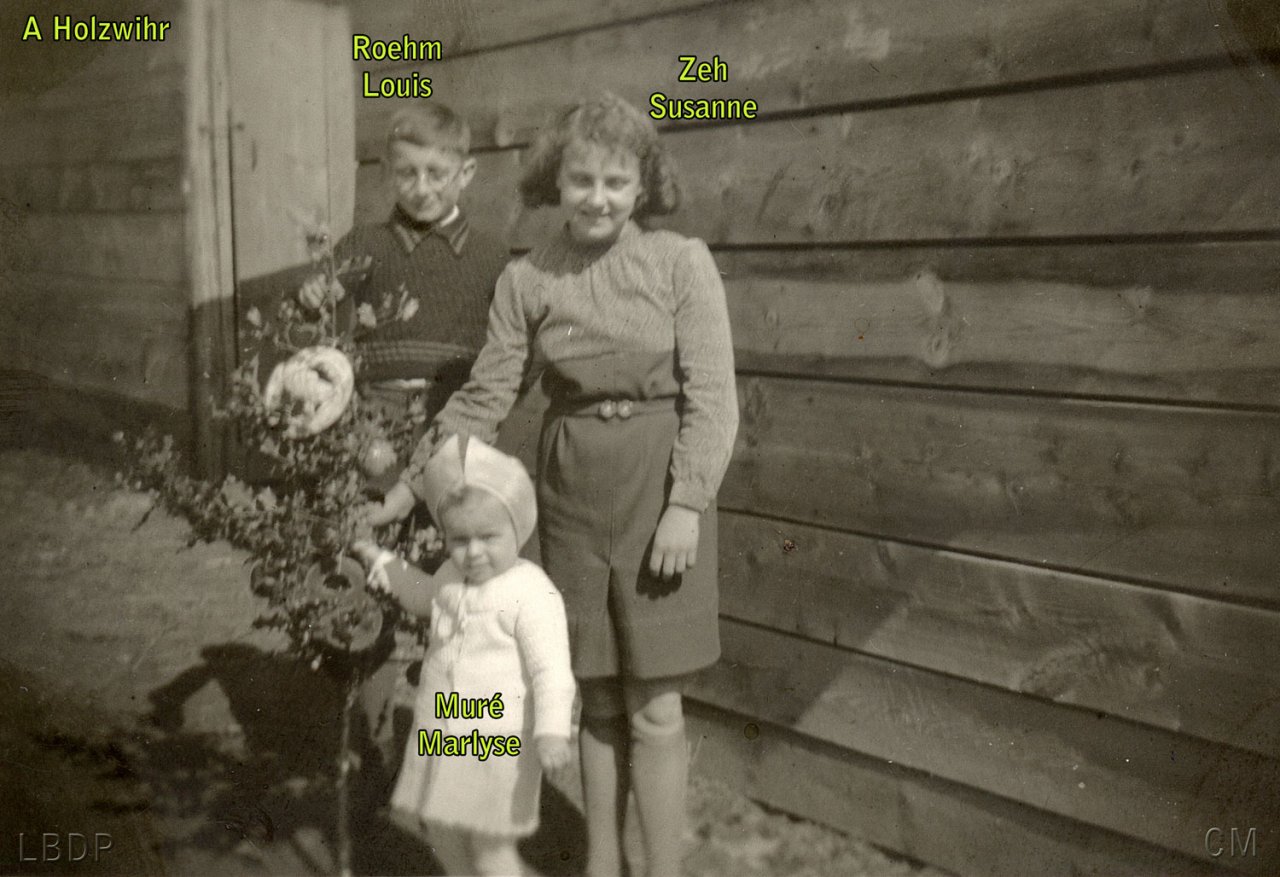 20 - Le bain de Marie-Claire et de Muré Marlyse entre deux rangées de baraques en été 1943, à "Holtzwihr"
