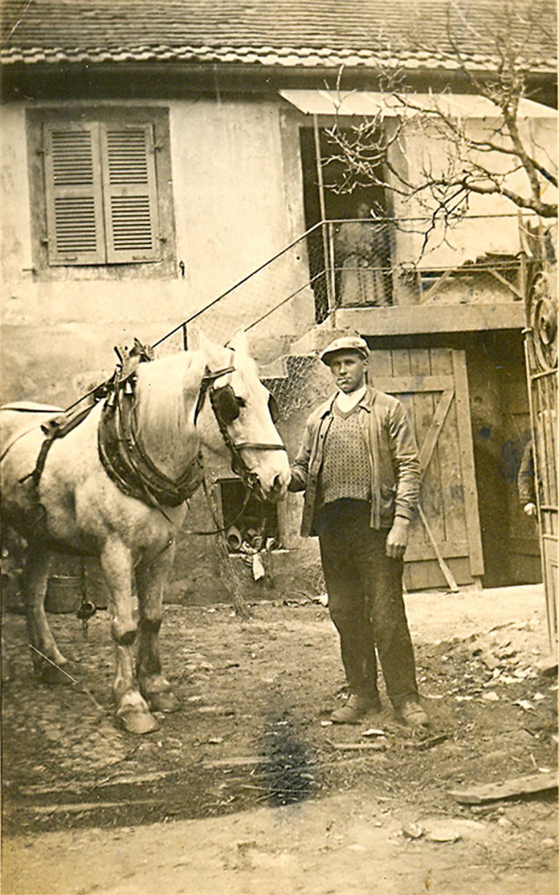 39 - Heinrich Henri avec son cheval, dans la cour de la maison familiale, située rue du château