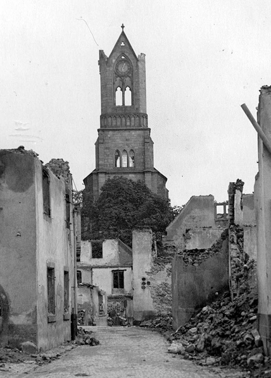 Lors des bombardements du 18 juin 1940, l’église fut fortement endommagée. Le déblaiement de l’édifice et sa reconstruction furent confiés à l’entreprise Roos de Munster à partir de 1947. Les travaux furent clôturés par une bénédiction le 11 novembre 1949.