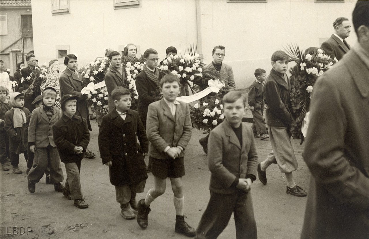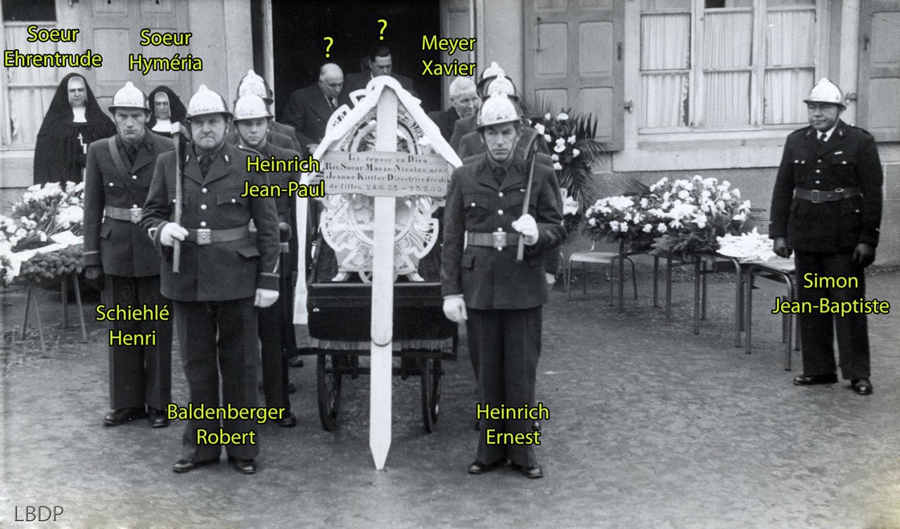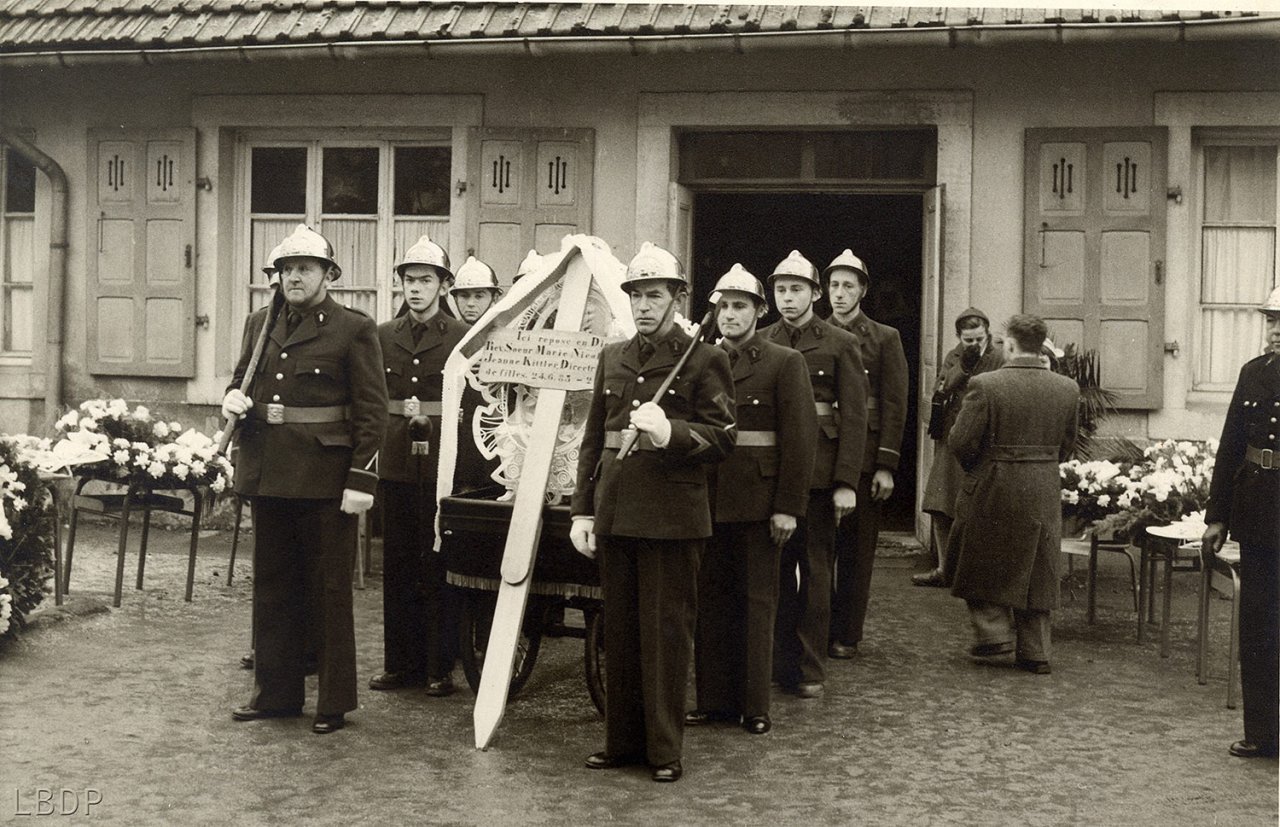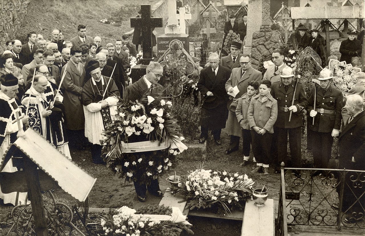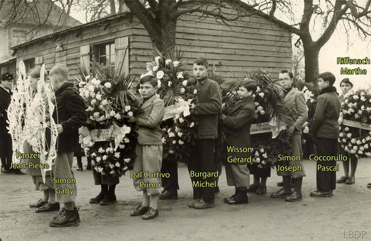 Le cercueil devant le foyer Saint Sébastien. - En 1955 c'était l'école des filles.