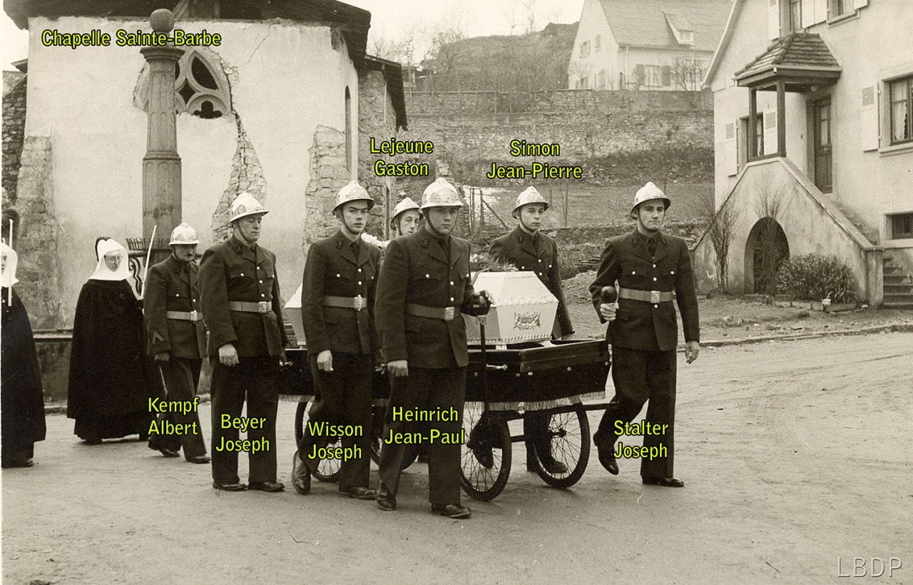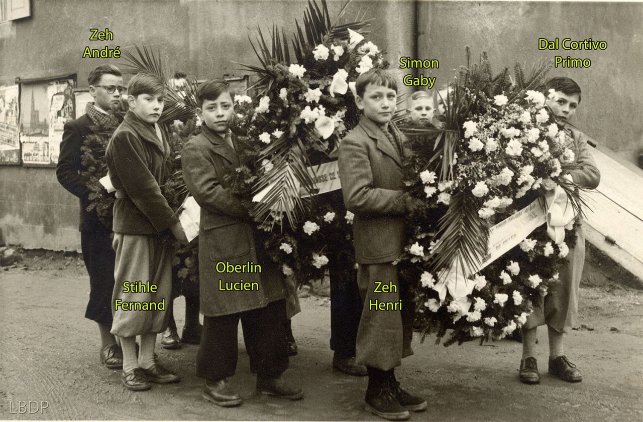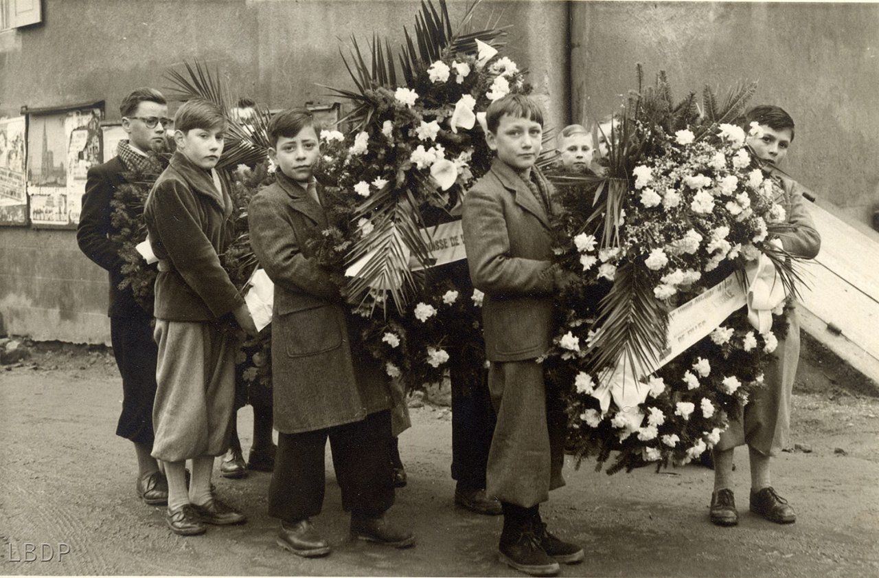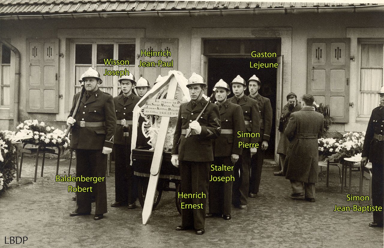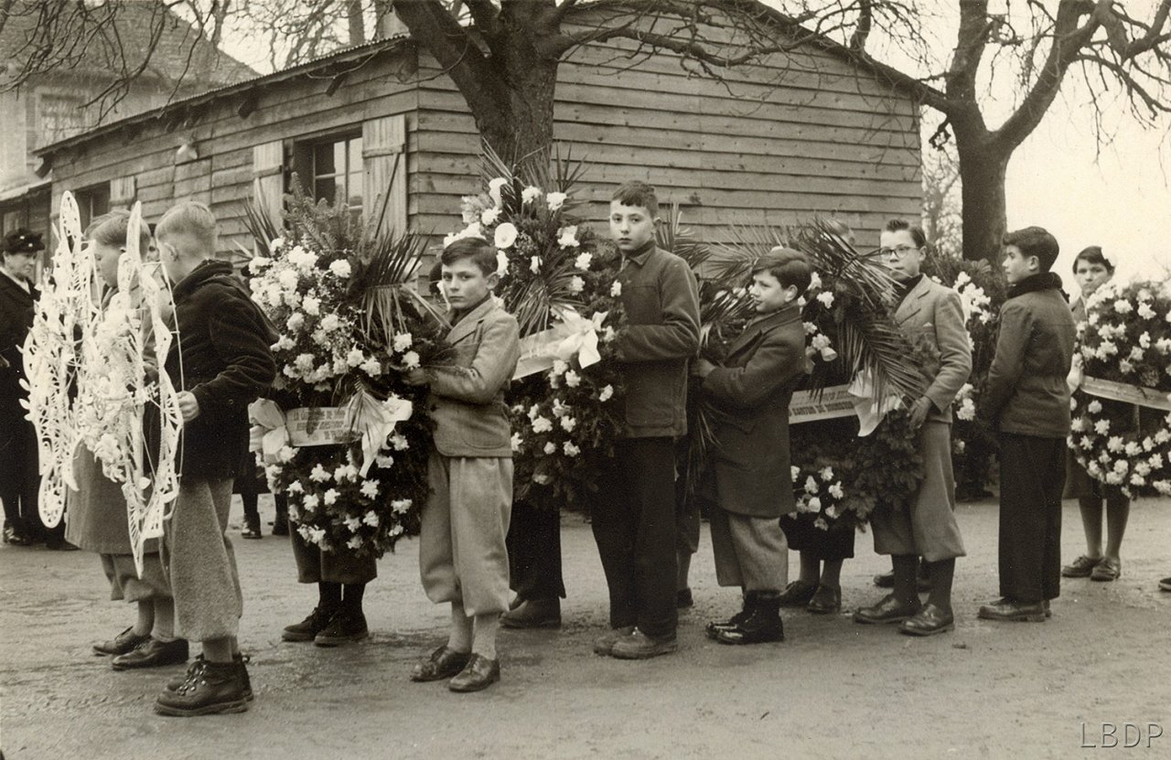 Le cercueil devant le foyer Saint Sébastien. - En 1955 c'était l'école des filles.