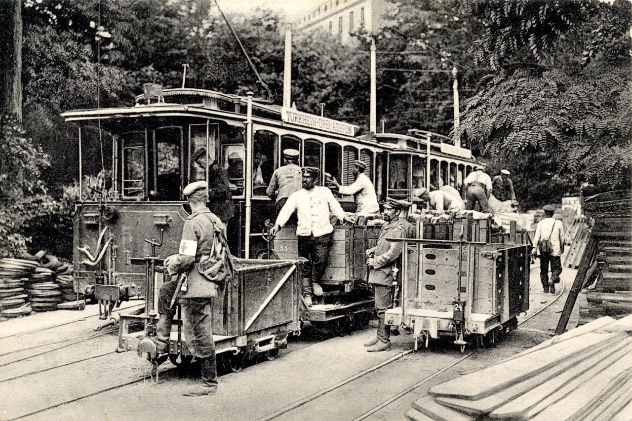 La guerre de 1914-18 changea tout cela ; la ligne, vu la proximité du front, devint "militaire". Les trams, inlassablement, acheminaient des munitions et du matériel en direction du Linge et de ses tranchées. Les troupes montaient à pied, sauf en de très rares exceptions, mais les blessés étaient souvent descendus par la ligne.