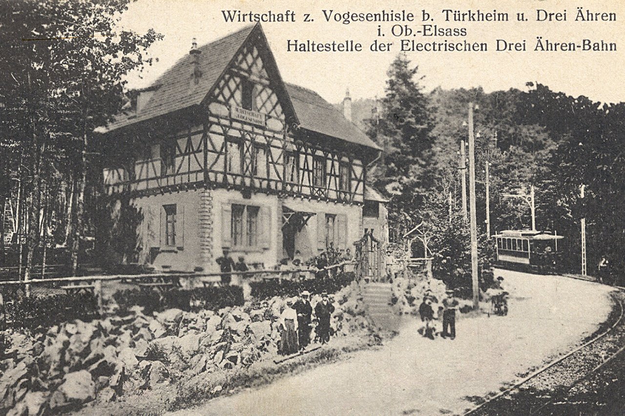 L'histoire de ce tramway commence en 1899, sous le régime allemand, et se termine en 1933. La ligne, construite par une firme de Nuremberg, partait de Turckheim sur la rive gauche de la Fecht, à la hauteur de l'actuelle place de la République. Elle suivait la berge jusqu'au pont supérieur, où elle passait sur le côté droit de la route des Trois-Epis, s'arrêtant au "Vogesahisla". Là, elle pénétrait dans la forêt, se dédoublait sur quelques mètres au Frauenberg pour permettre le croisement, au niveau du parking actuel, et par le Hunabuhl rejoignait la route de Niedermorschwihr, puis grimpait jusqu’a l'hôtel de la Croix d'Or, le terminus.