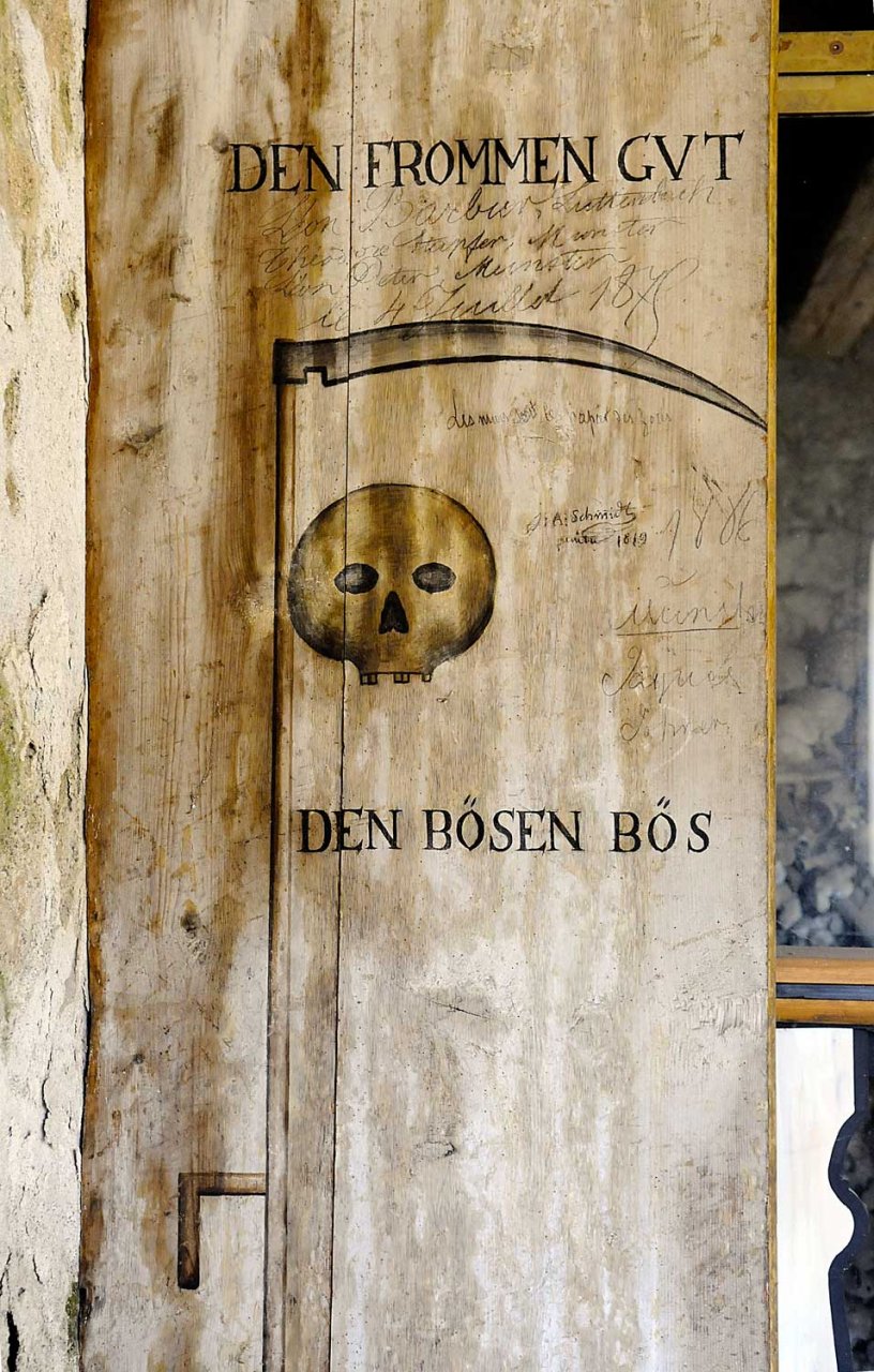 06 - L'ossuaire à l'intérieur de la chapelle ; le panneau de gauche : bon envers les pieux, mauvais envers les méchants