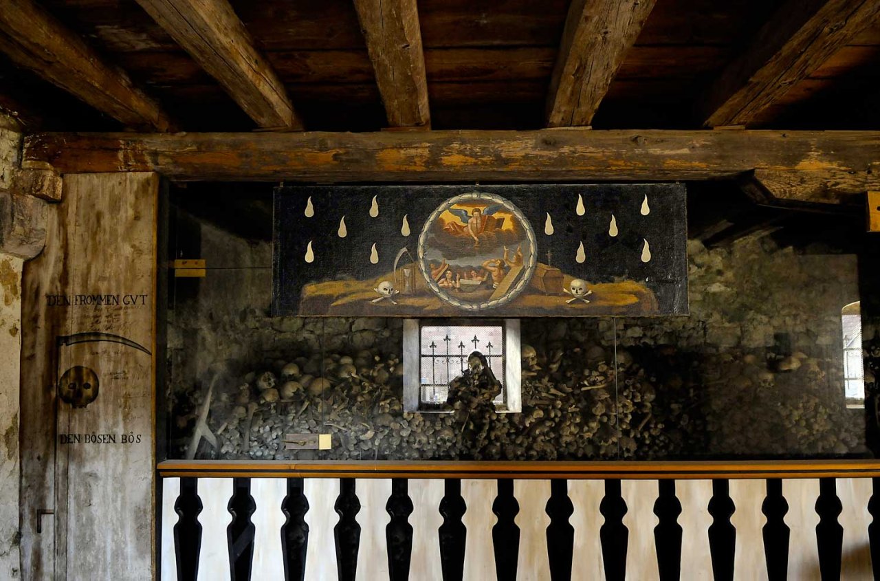 08 - L'ossuaire à l'intérieur de la chapelle ; le panneau de droite : aujourd'hui c'est mon tour, demain sera le tien