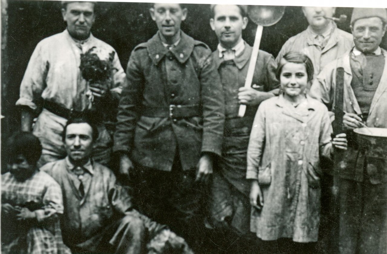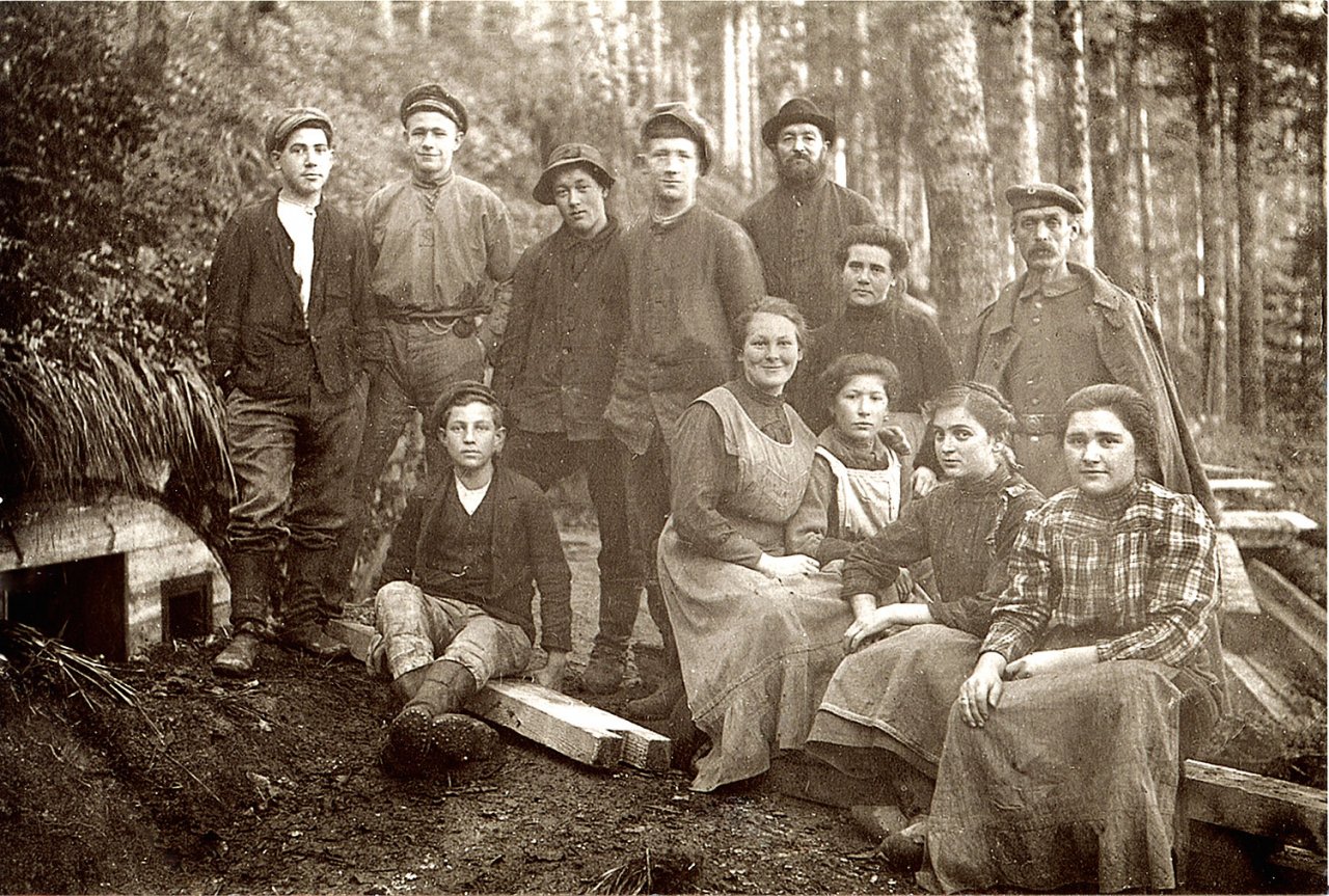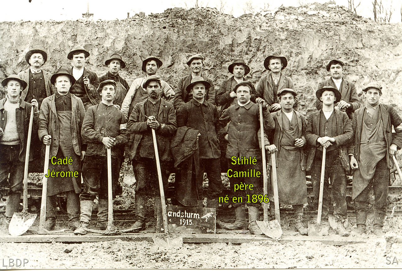 Une équipe de manoeuvres réquisitionnés pour les travaux d'entretien de chemins et d'abris durant la grande guerre dans la forêt de Wihr