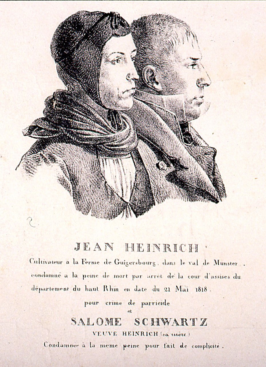 Jean Heinrich, cultivateur à la ferme de Guigersbourg dans le Val de Munster, a été condamné à la peine de mort par arrêt de la cour d'assise du département du Haut Rhin en date du 21 mai 1818, pour crime de parricide et Salomé Schwartz, veuve Heinrich (sa mère), a été condamnée à la même peine pour fait de complicité.
