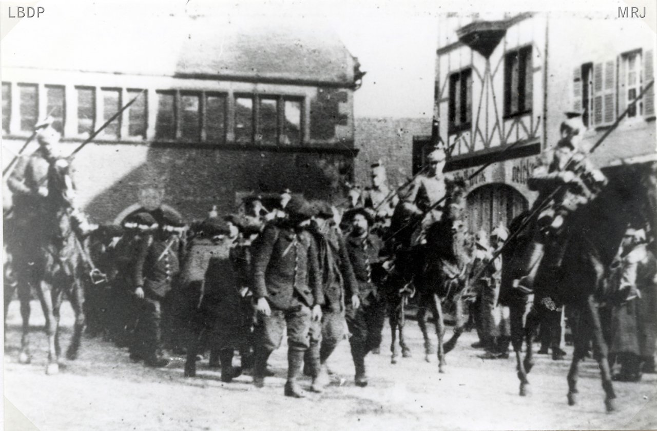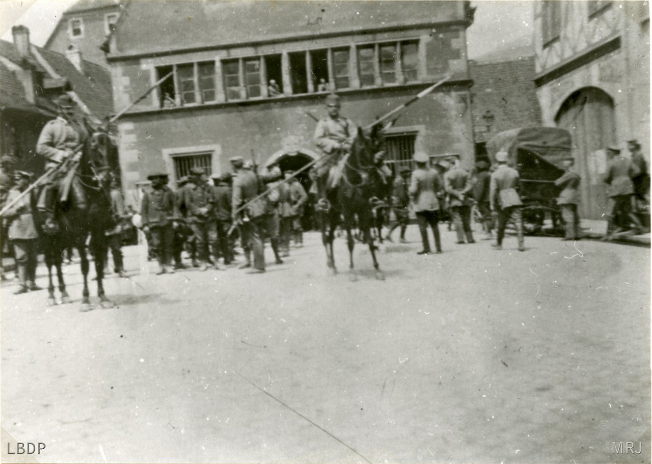 Les Allemands escortent des prisonniers français, des chasseurs alpins, devant la mairie de Munster