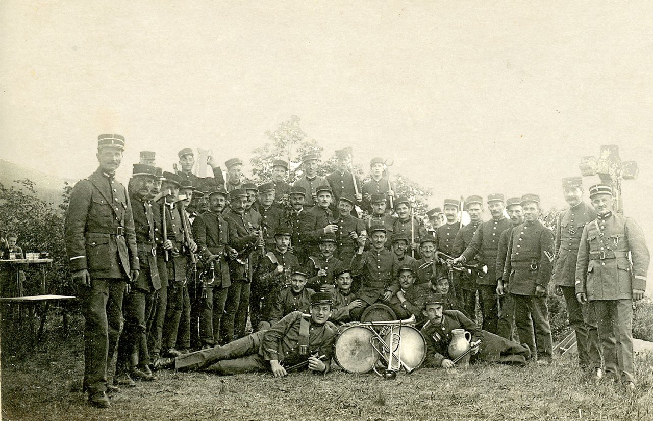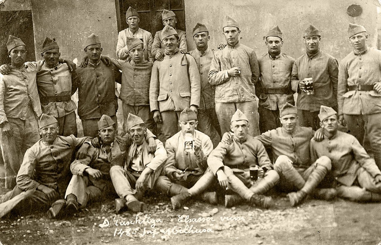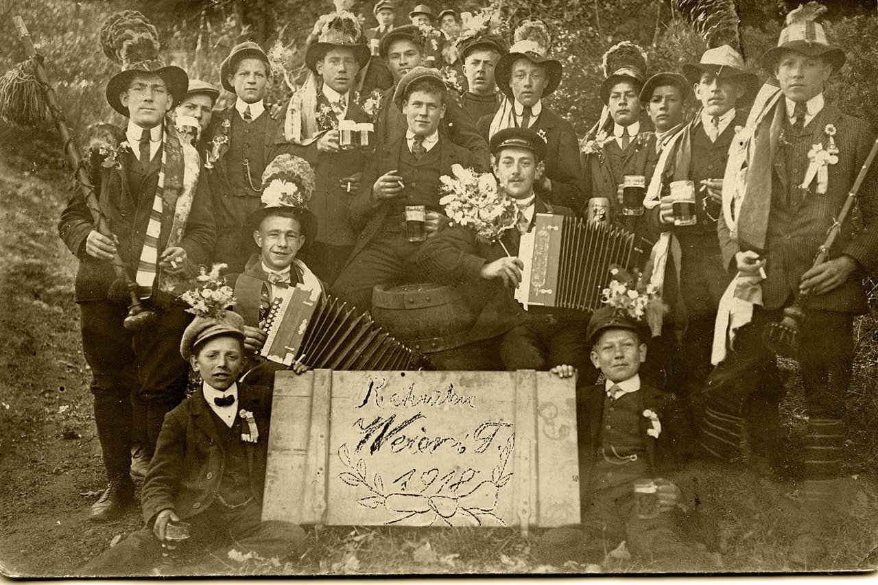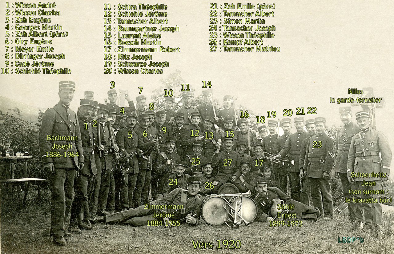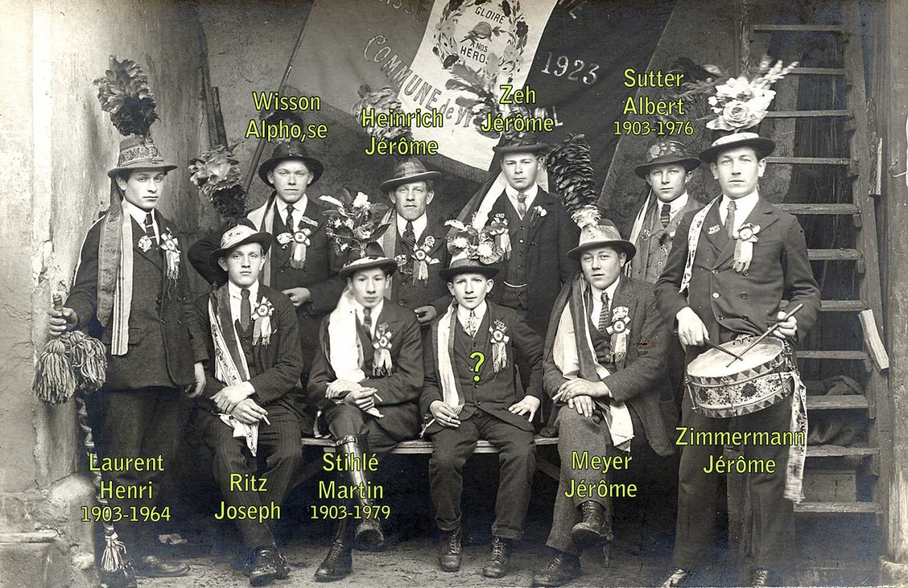 Sur la pancarte on lit : Rekruten Weier im Thal 1918 (les conscrits de Wihr au Val 1918)